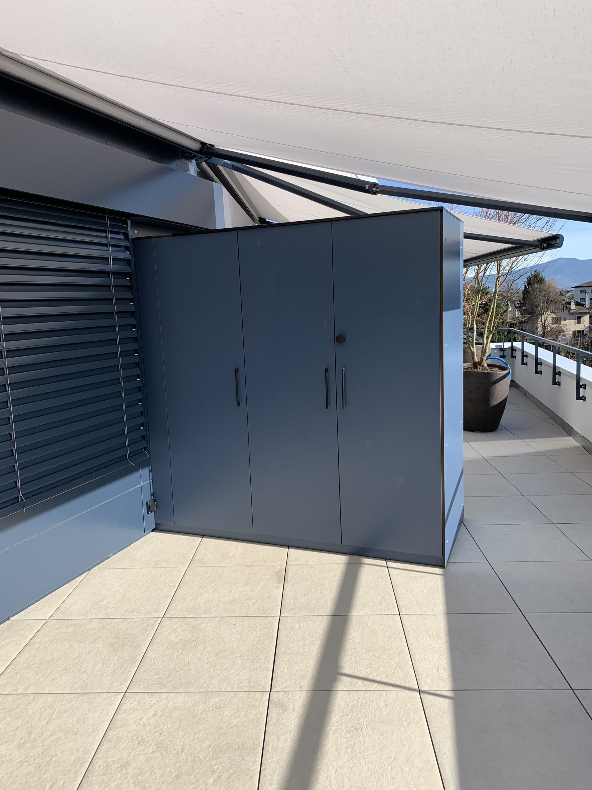 Armoire intérieure en multi-plis bouleau perlé, spécialement confectionné avec de la résine polypropylène pour une utilisation extérieur. Enveloppe extérieure en Argolite 390 Pacific AM pour se marier parfaitement avec la paroi. Poignées et casquette haute thermolaquées en noir.