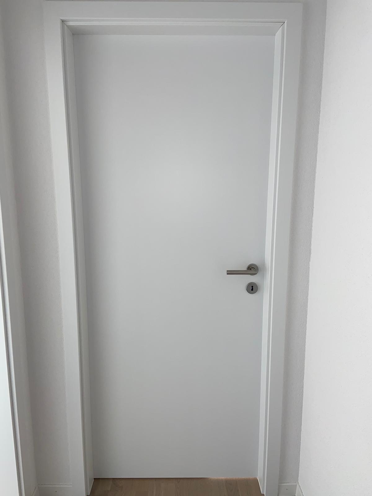 Porte mi-lourd finition Astra CPL laqué 9016 avec poignée et garniture Topaz de chez Glutz posée sur cadre faux-cadre embrasure.